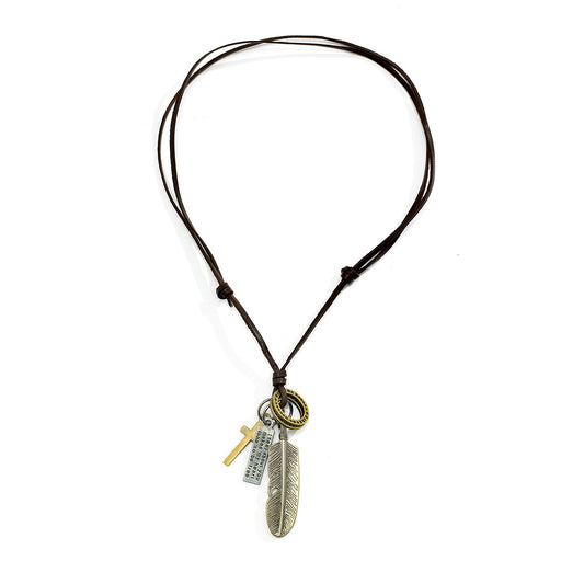 Vintage Fashion Leather Chain with Feather and Cross Design Versatile Pendant Necklace