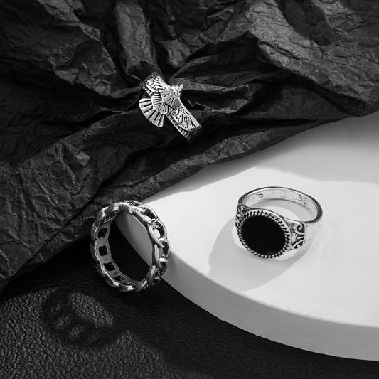 Trendy Personality Winged Eagle/Inlaid Black Gem/Simple Chain Design Versatile Ring Set