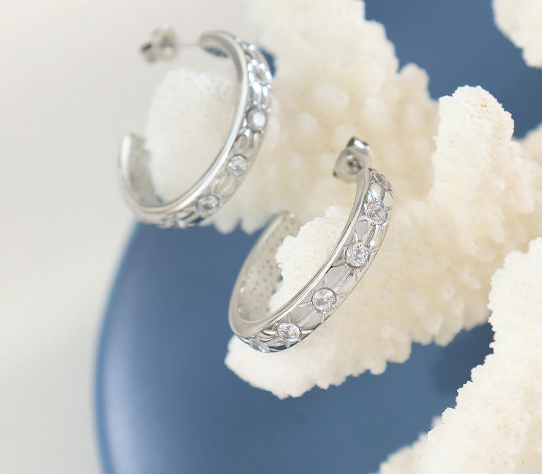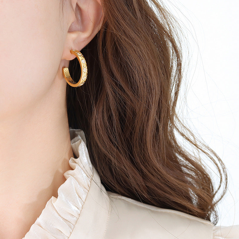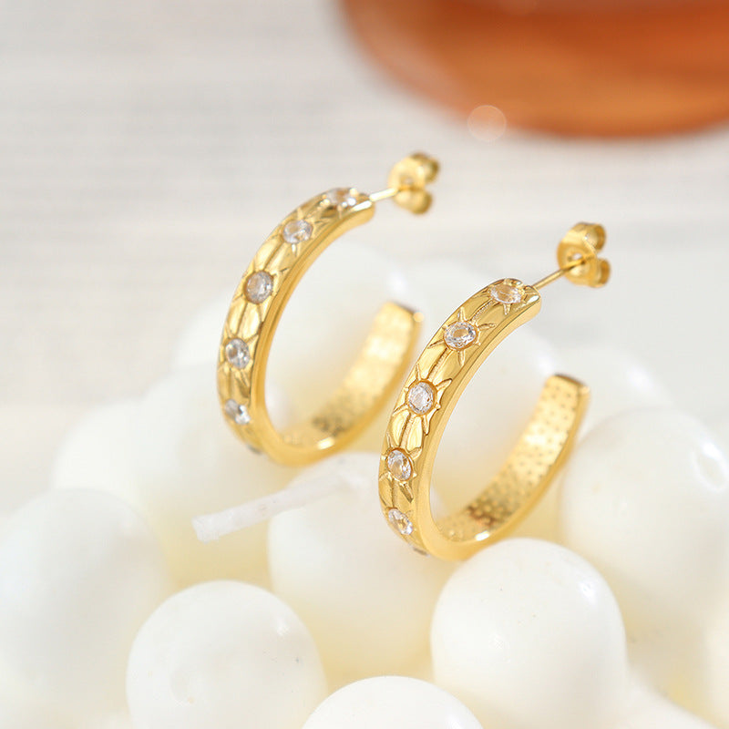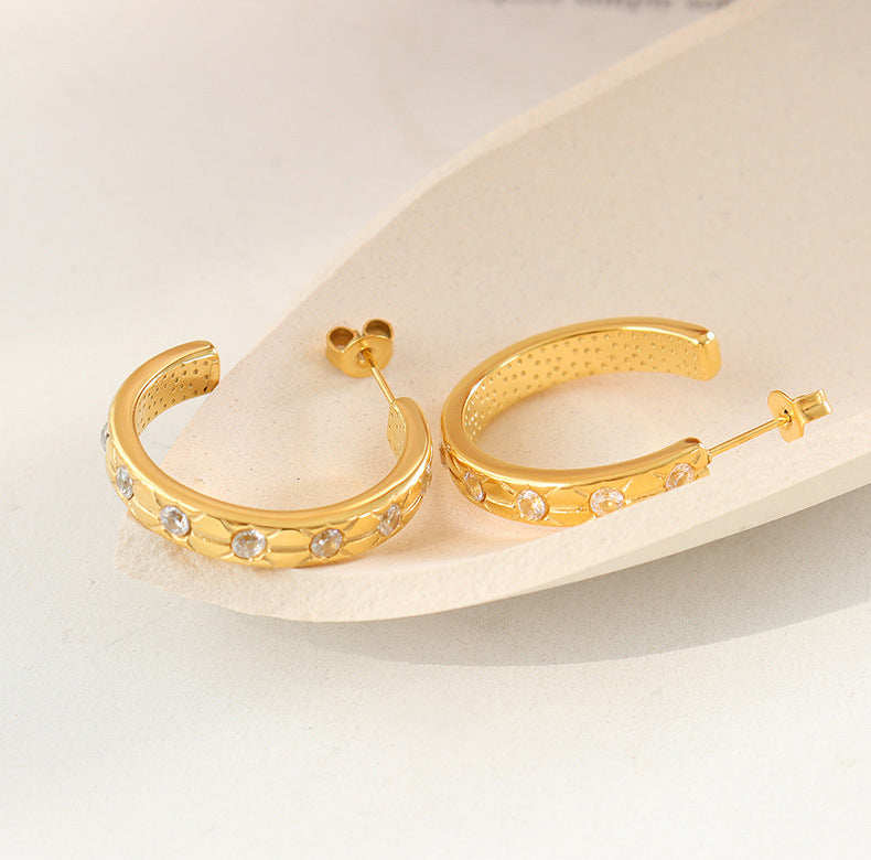 18K Gold Exquisite Dazzling C-shaped Earrings with Star Pattern Inlaid Zircon Design Versatile