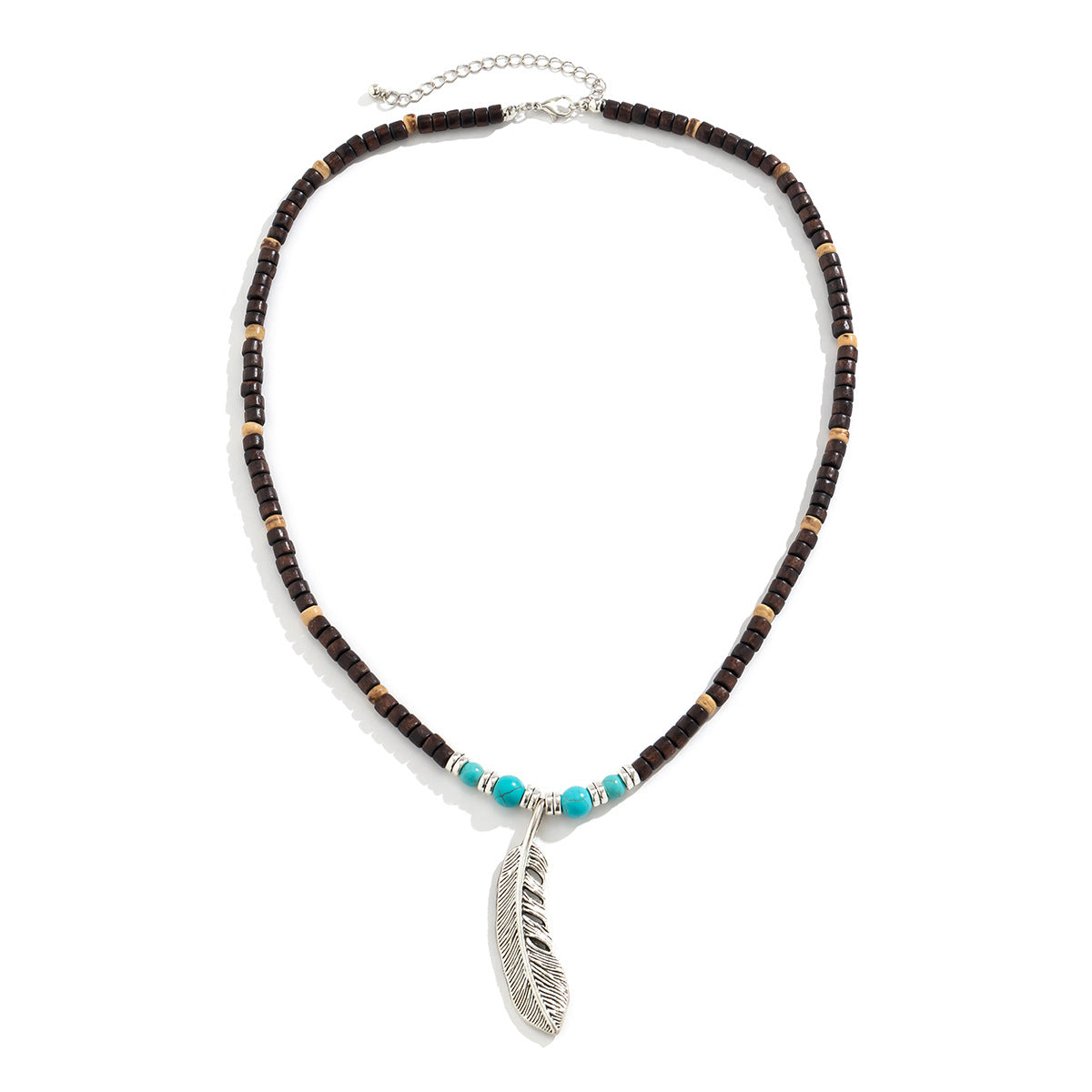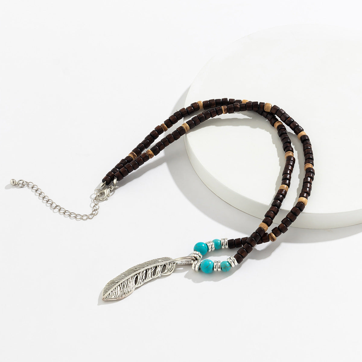 This sophisticated on-trend panel of wood beads and turquoise with a feather design pendant necklace is a unique and stylish accessory. Here is the description of this necklace: