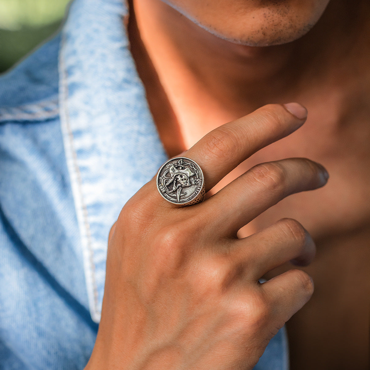The top of the ring takes on the shape and features of a pirate such as an anchor, captain, knife, and more. Viking details and silhouettes are represented by engraving or casting techniques.
